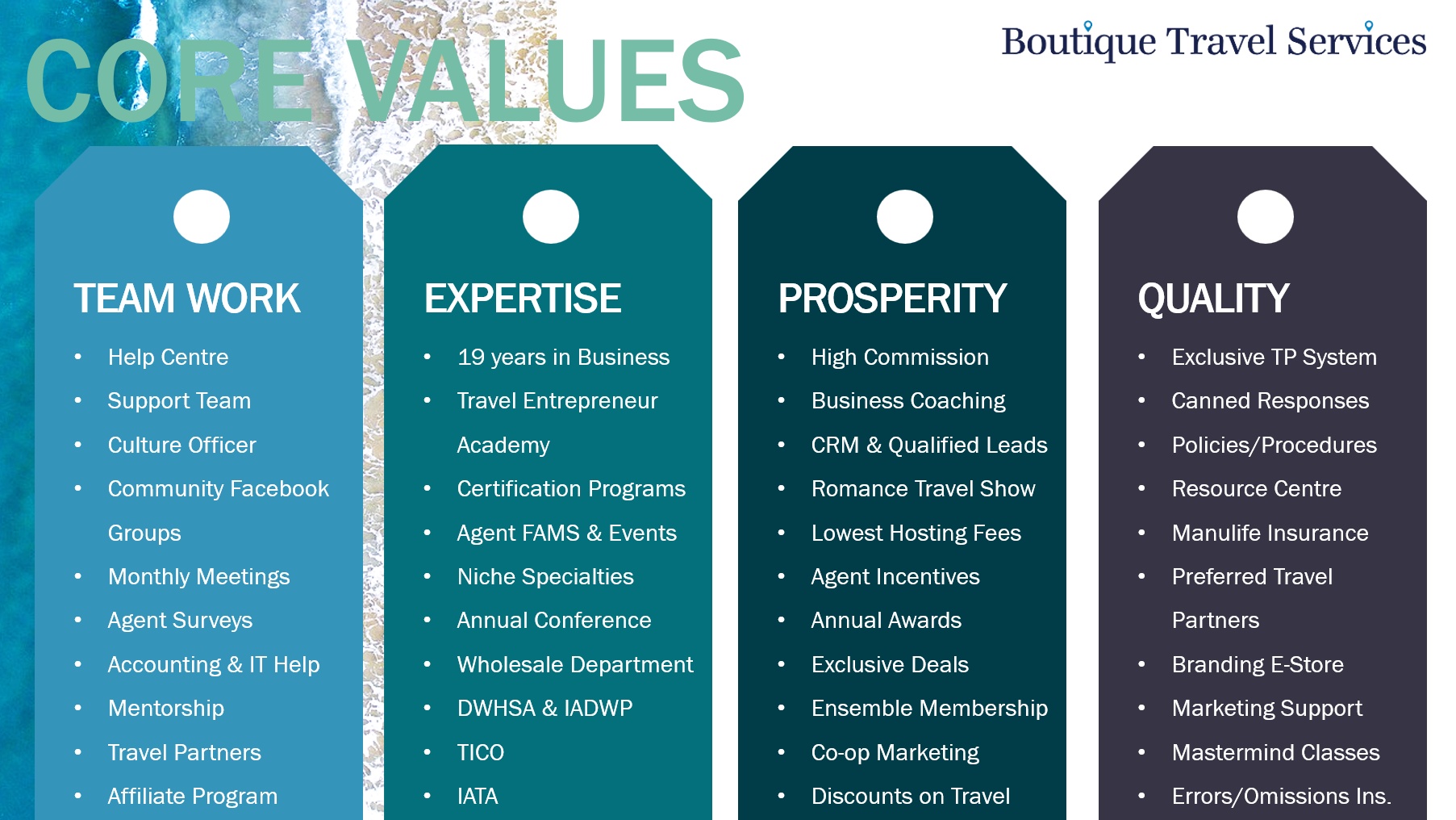 BTS is definitely a first class organization. The culture is very positive and caring! Laurie (Founder & President) and our management team, are fantastic and excellent motivators. They are always there to support you whether you are a new travel agent just starting out or an experienced travel professional. The agents are also always there for you! The team atmosphere is first class and you always feel connected. The agency has excellent relations with suppliers and is very well respected amongst their peers in the industry. I’m glad that I am part of such an amazing Host Agency. It has allowed me continued success in my travel business allowing me to provide my clients with the most knowledgeable and excellent customer service!